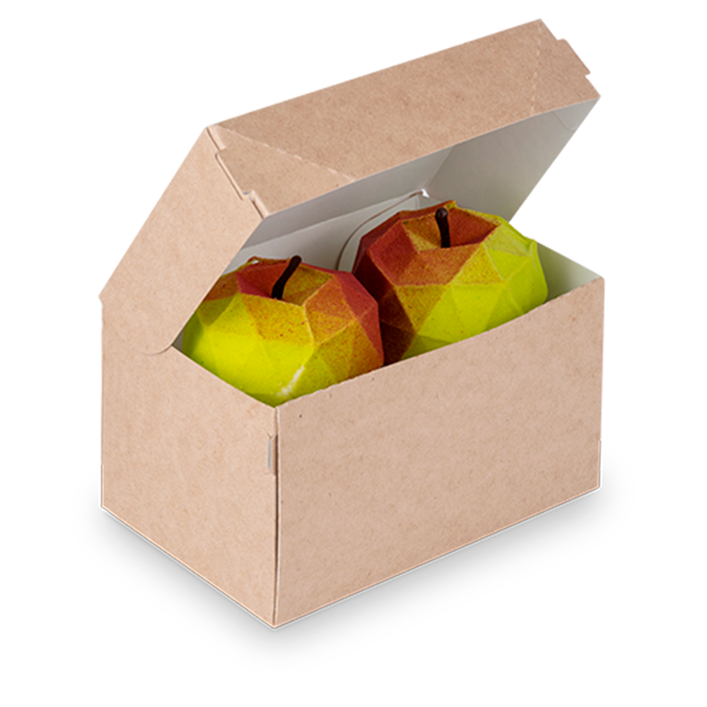 Коробка поставляется в плоском виде и требует минимум места и затрат на хранение. Идеально подходит для пекарен, кафе, услуг кейтеринга, take away и гастрономов.