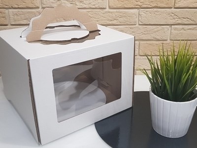 Упаковка изготавливается из микрогофрокартона, отличающегося высокой прочностью и устойчивостью. В ней есть три прозрачных окна, через которые можно хорошо рассмотреть десерт. Также коробка имеет надежную ручку для переноски торта. Подходит для упаковки десертов среднего размера.